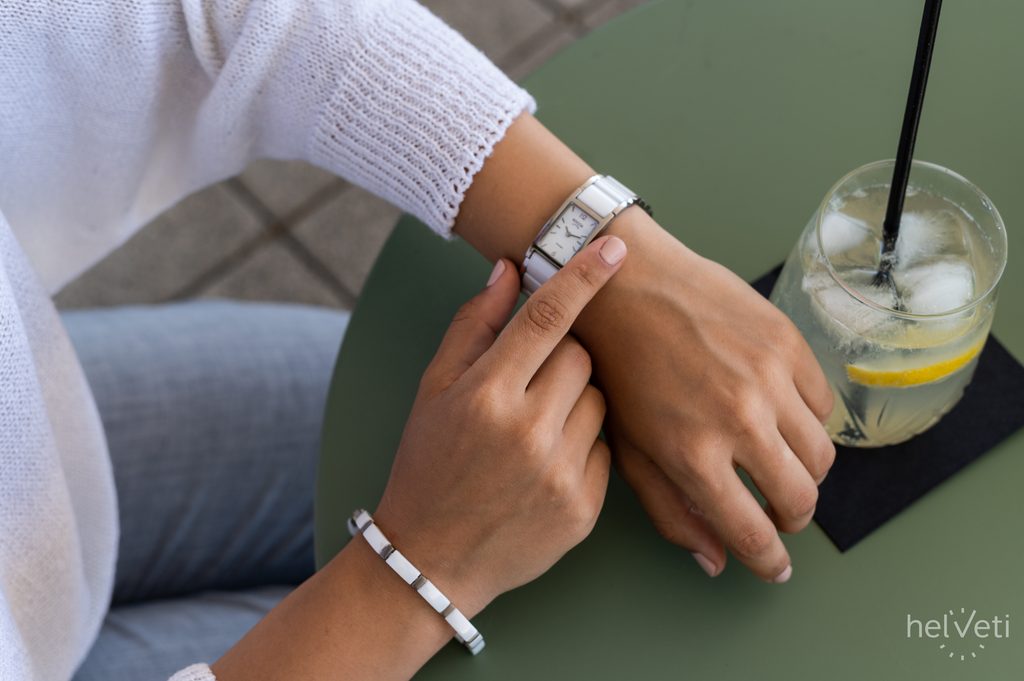 Dámské hodinky Boccia Titanium 3201-01 s pouzdrem obdelníkového tvaru. Střed titanového tahu je vyplněn bílými keramickými díly, které ladí s bílým ciferníkem.