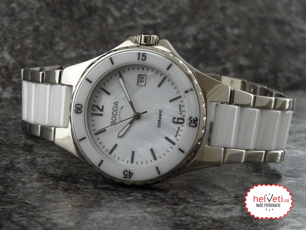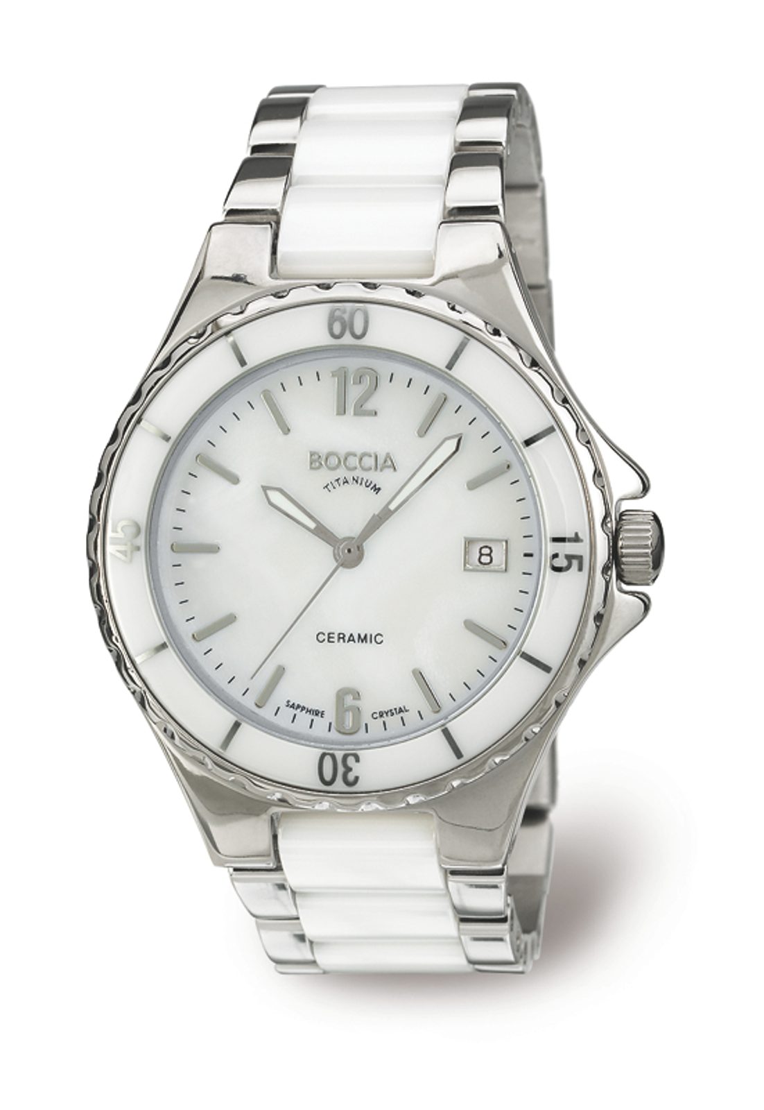 Dámské hodinky Boccia Titanium 3215-01 mají vše, co co by mohla moderní žena od hodinek očekávat. Bílý ciferník v perleťovém provedení je chráněn safírovým sklem odolným vůči poškrábání. V jeho pravé části se nachází ukazatel data. Hodinky jsou vodotěsné až do hloubky 10ATM. Titanový tah je vyplněn keramickými díly. Díky použitým materiálům se jedná o velmi lehké a na dotek příjemné hodinky. Díky kombinaci keramické lunety a safírového sklíčka získávají hodinky na odolnosti a delší životnosti. Hodinky se nepoškrábou a vydrží dlouho jako nové.