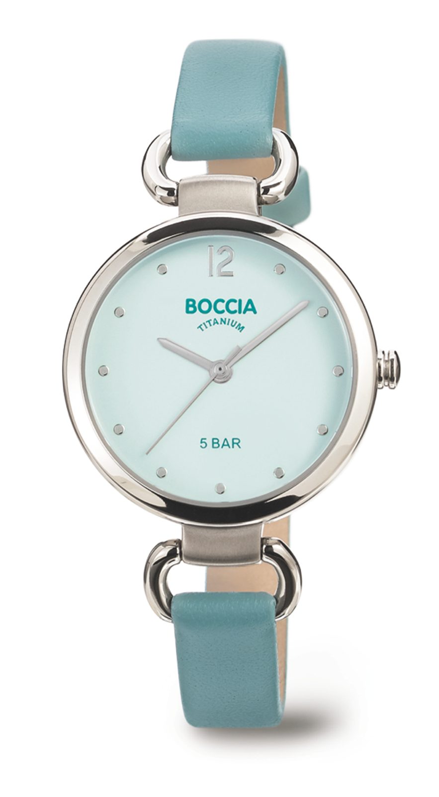 Dámské hodinky Boccia Titanium 3232-03 zaujmou netradičním upevněním koženého řemínku k titanovému pouzdru. To je řešeno formou oka. Kožený řemínek má světle modrou barvu, je velmi tenký a pevný. Hodinky jsou vodotěsné do 5ti atmosfér.