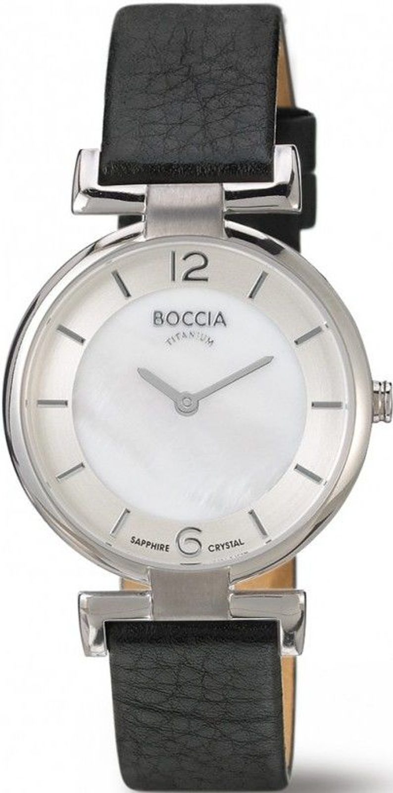 Dámské hodinky Boccia Titanium 3238-01 jsou novinkou pro rok 2014. Kulaté titanové pouzdro je ke koženému řemínku připojeno elegantní sponou. Ciferník je rozdělen na dvě části, z nichž vnitřní má perleťový podklad. Celý ciferník je chráněn safírovým sklem.