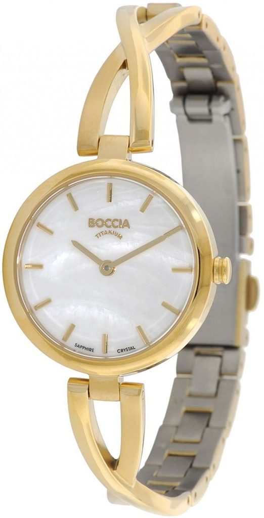 Dámské hodinky Boccia Titanium 3239-03 jsou novinkou roku 2014. Mají úzký titanový tah, zdobený zlatem, který je uchycen k hodinkám netradičním způsobem. Ciferník kulatého tvaru chrání safírové sklíčko.