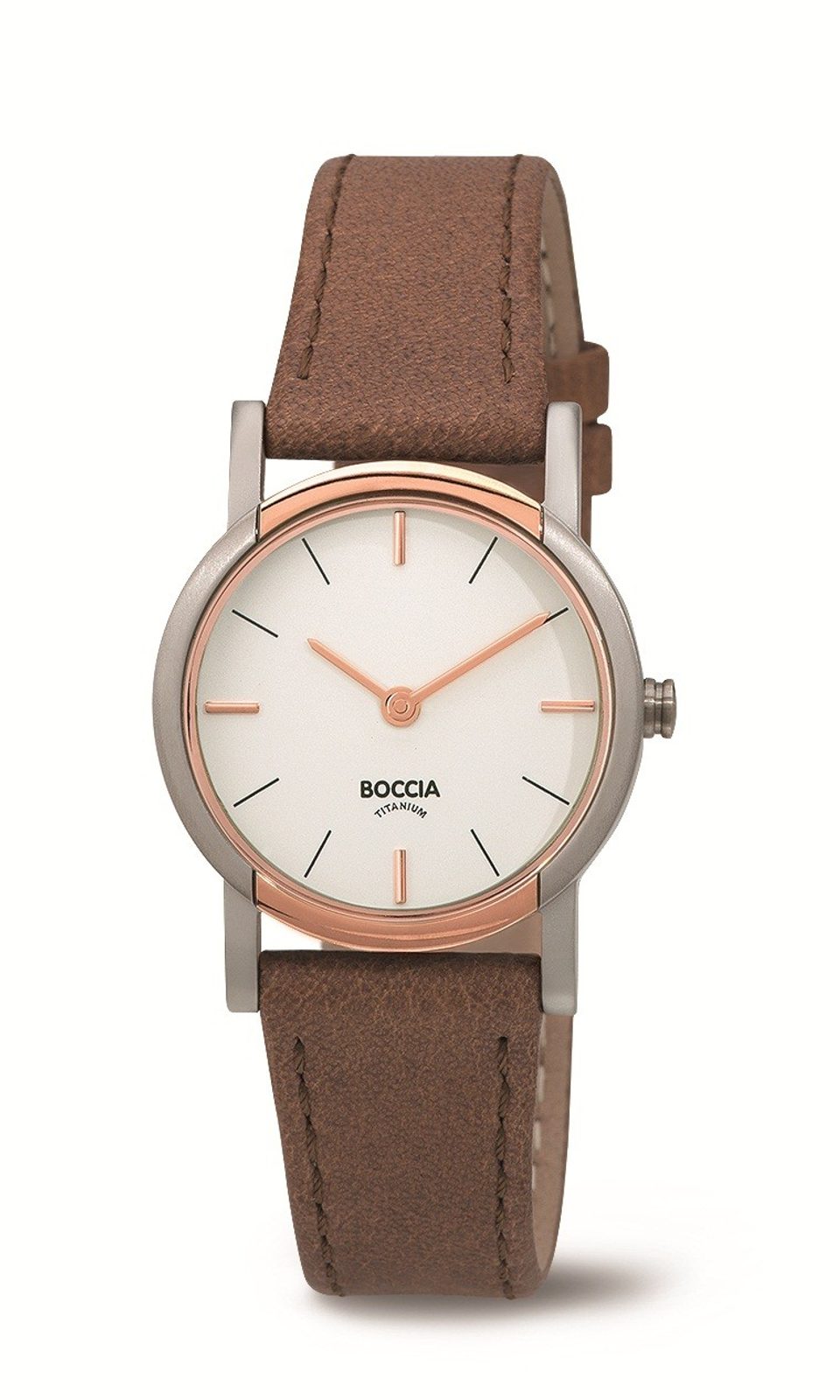 Dámské hodinky Boccia Titanium 3247-03 jsou specifické elegantním zlatým pruhem procházejícím přes pouzdro hodinek. Tenké a zároveň velmi lehké hodinky pro každou příležitost. Na ruce drží díky řemínku hnědé barvy.