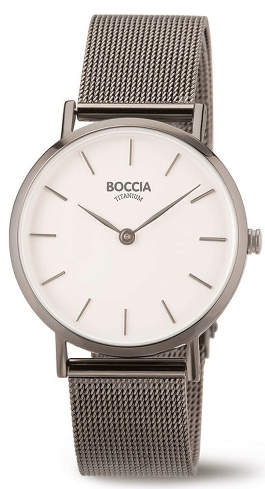 Dámské hodinky Boccia Titanium 3281-04 disponují kulatým titanovým pouzdrem s PVD úpravou, které ukrývá bílý ciferník s velmi jednoduchým a elegantním designem. Model je dále doplněn černým páskem z pletené oceli rovněž s PVD úpravou. Hodinky jsou určeny pro běžné nošení, ale také do společnosti.