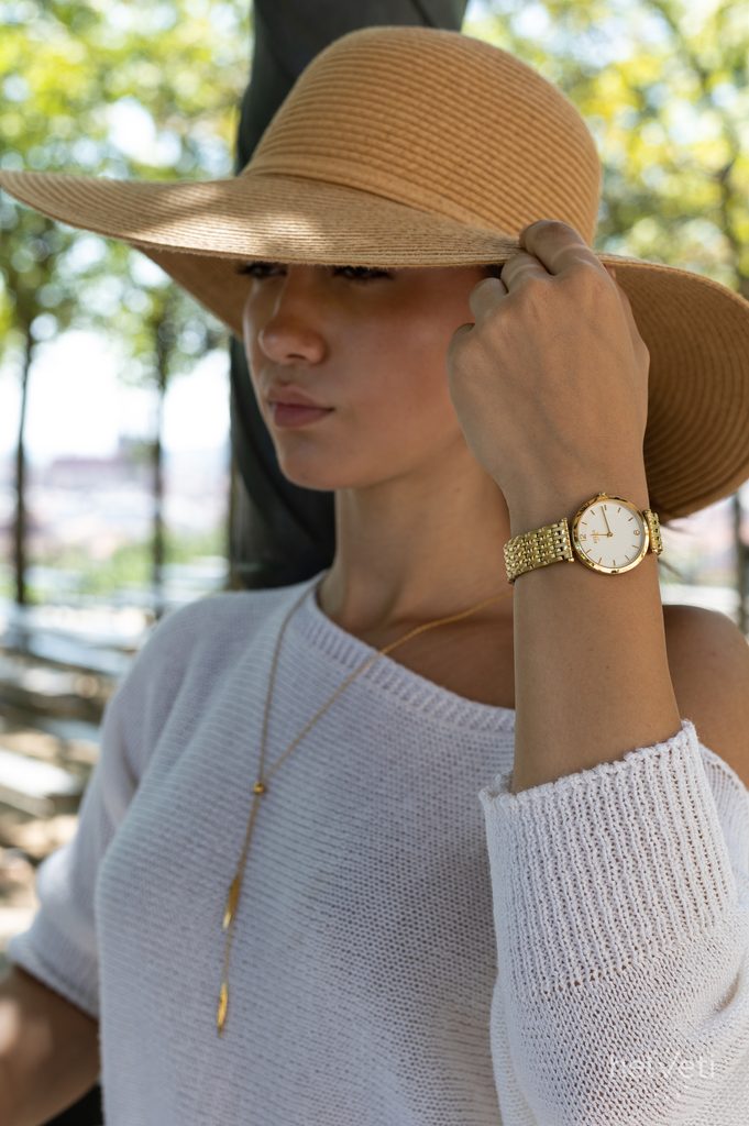 Hodinky mají kulaté titanové pouzdro se zlatou PVD vrstvou, které doplňuje titanový náramek ve zlatém provedení. Celkový dojem z hodinek dotváří velmi zajímavý design bílého ciferníku s vaflovým efektem.