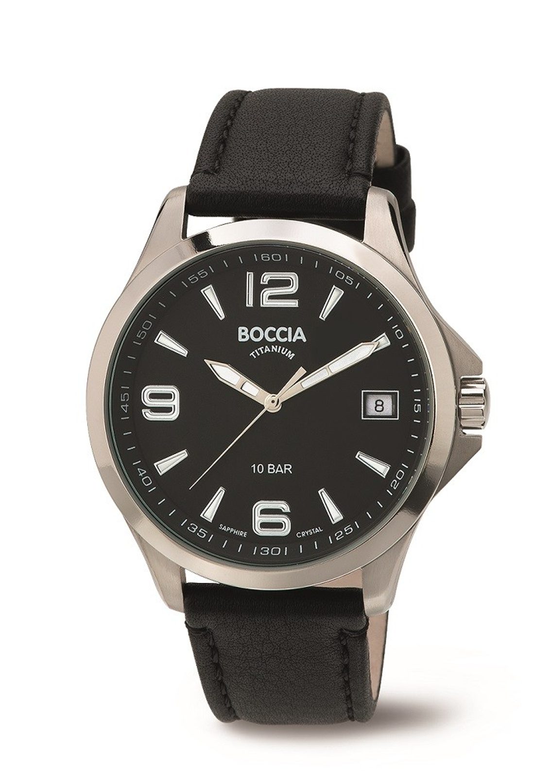 Pánské hodinky Boccia Titanium 3591-01 mají kulaté titanové pouzdro, které drží na ruce díky koženému řemínku. Ciferník, jenž obsahuje ukazatel data je chráněn safírovým sklíčkem. Hodinky jsou vodotěsnédo 10 atmosfér.