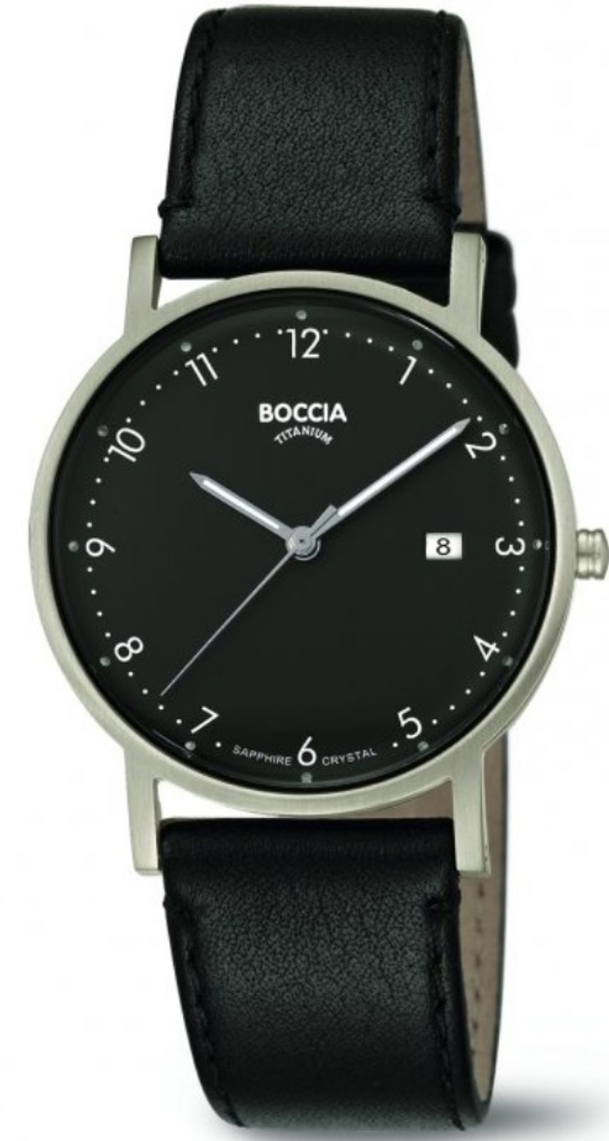 Titanové pouzdro hodinek Boccia Titanium 3636-02 v sobě ukrývá bateriový strojek s přesností ±15 s / měsíc. Elegantní a přehledný ciferník černé barvy je chráněn safírovým sklíčkem, které je maximálně odolné vůči poškrábání. Voděodolnost modelu je 50 m, což vystačí na mytí rukou či déšť. Rozměrem pouzdra 38 mm se řadí mezi menší pánské hodinky. Na přehledném ciferníku pak najdeme ukazatel data na 3 hodině.