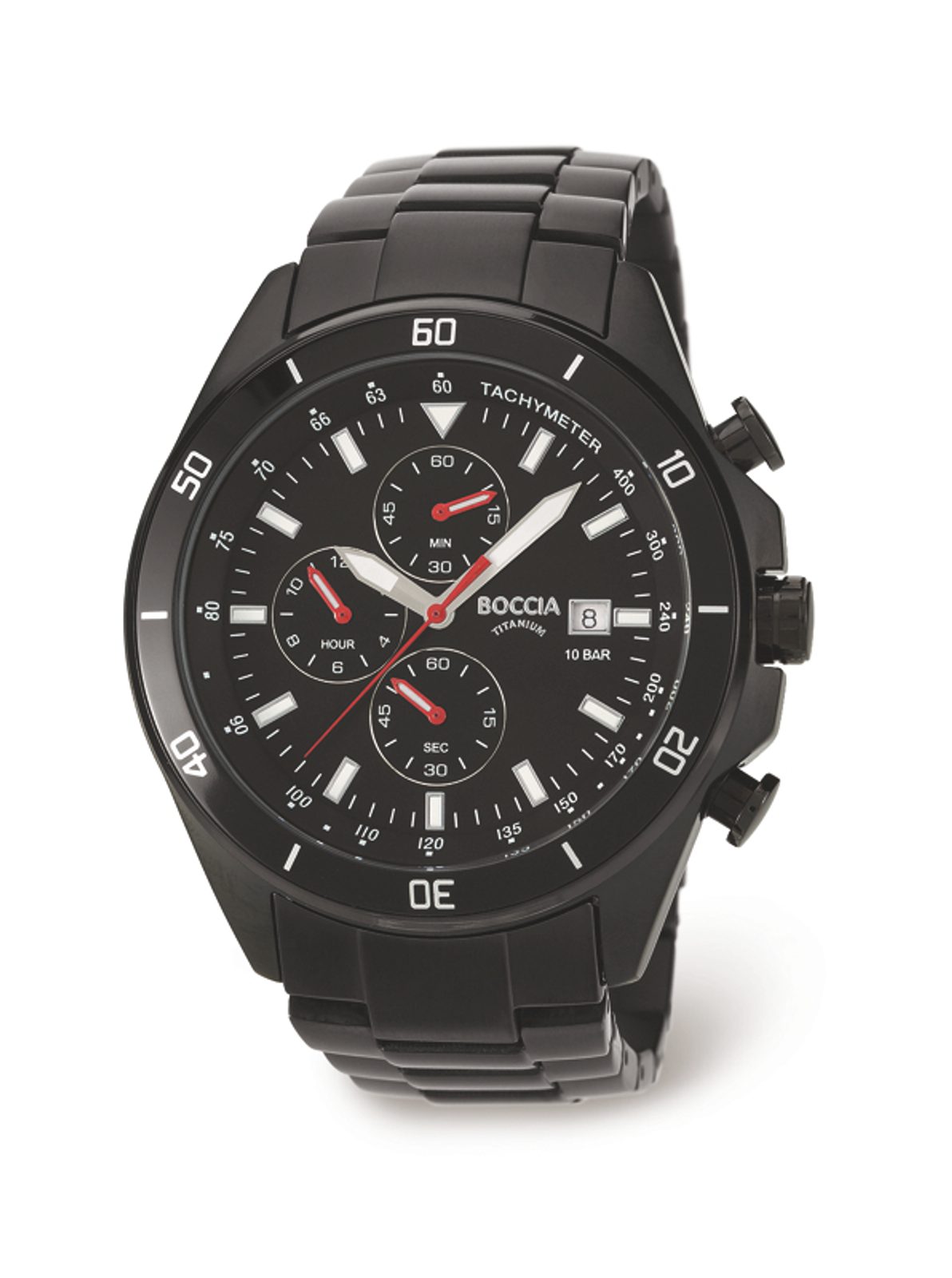 Pánské hodinky Boccia Titanium 3762-03 mají kulaté titanové pouzdro, které drží na ruce díky černému titanovému tahu. Ciferník hodinek je vyveden v černé barvě, obsahuje ukazatel data a chronograf. Hodinky jsou vodě odolné do 10 atmosfér.