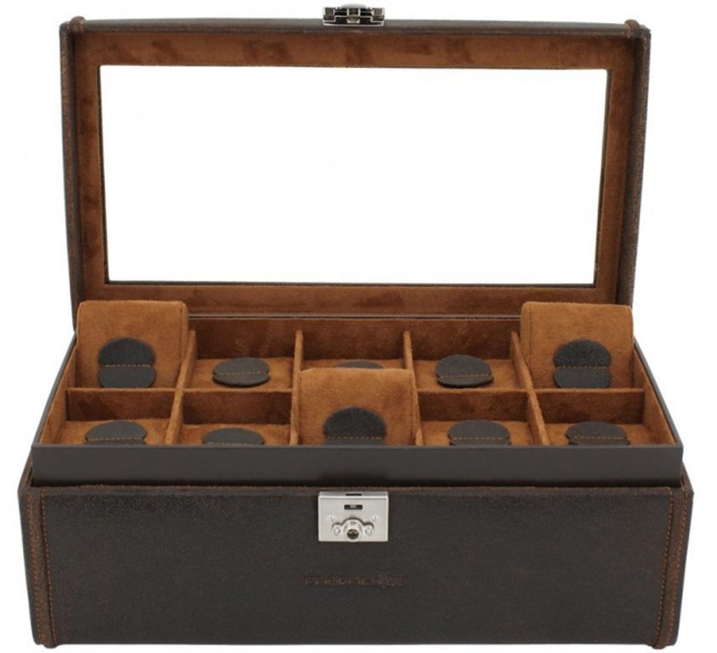 Elegantní pouzdro Friedrich Lederwaren Cubano 27024-6 pro 20 kusů hodinek s proskleným víkem. Vyrobeno z hnědé kůže ve vintage stylu s praktickou semišovou výplní světle hnědé barvy.
