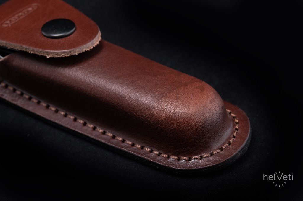 Nůž je dodáván s koženým pouzdrem.