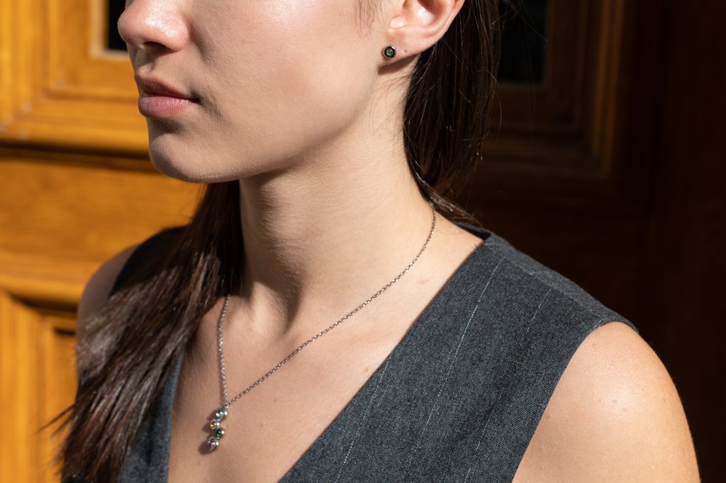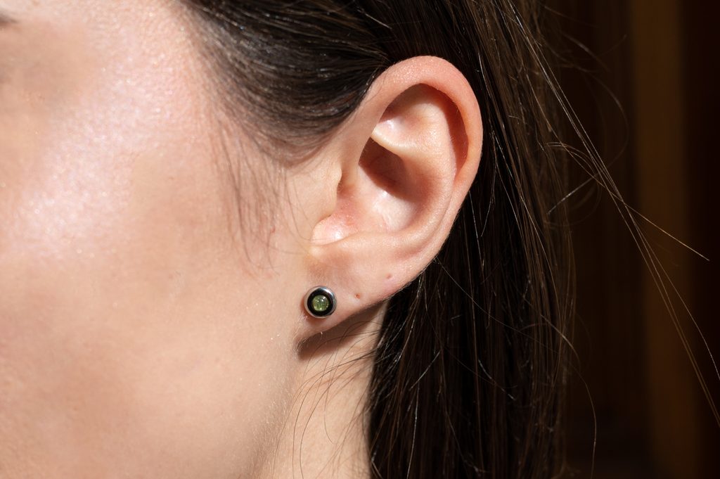 Titanové nášnice Boccia Titanium 05053-02 ve tvaru oblíbených kulatých pecek jsou ve svém středu osazené zelenými turmalíny o velikosti cca 0,3 karátu/pár.