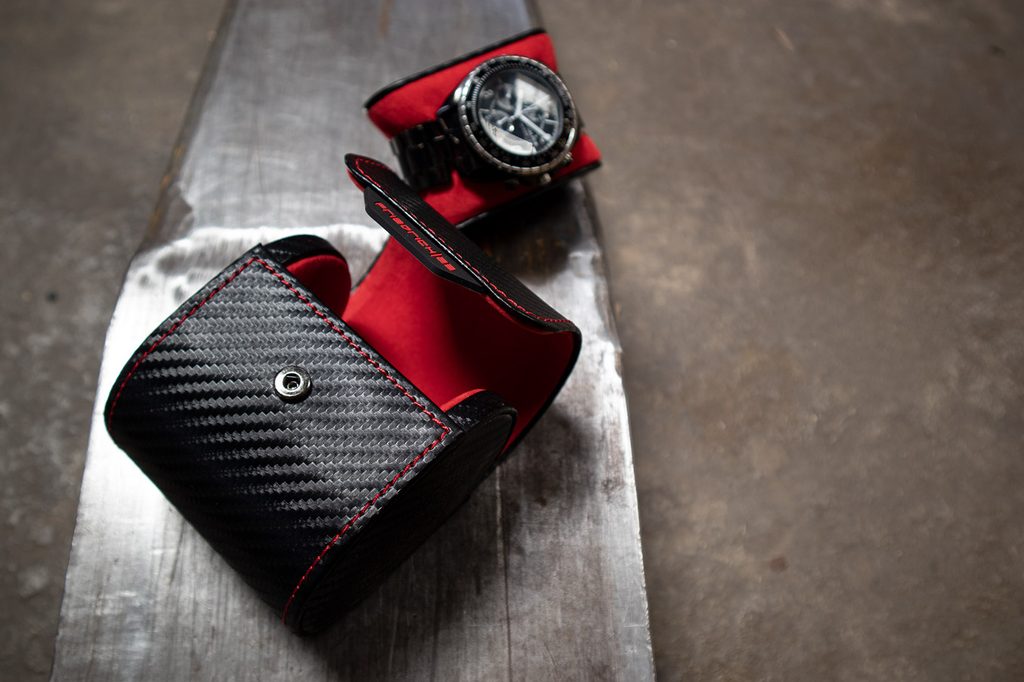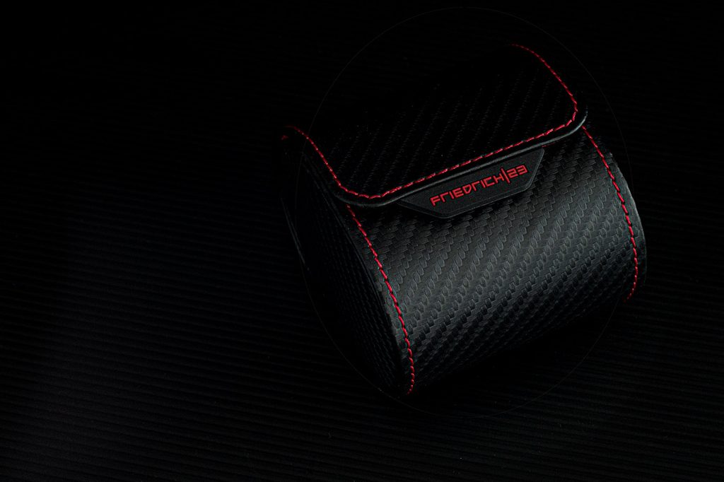 Praktické cestovní pouzdro Friedrich Lederwaren Carbon 32057-2 pro 1 kus hodinek. Vyrobeno ze syntetického materiálu černé barvy se vzorem karbonu. Vnitřek pouzdra a prošití je červené barvy.